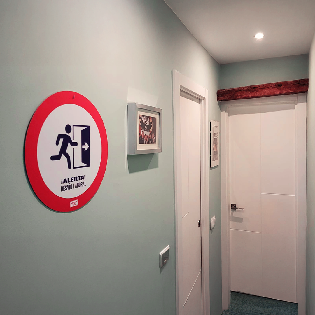 Placa circular diseño “Desvío Laboral” de 25×25 o 35×35 cm fabricada con materiales como aluminio, forex o lona plástica (a elegir entre esas 3 opciones). El diseño se imprime mediante tecnología de alta precisión, asegurando colores nítidos y duraderos.