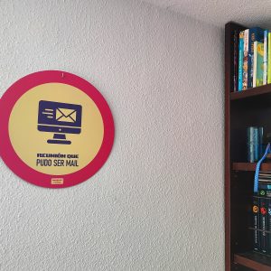 Placa circular diseño “Reunión que pudo ser mail» de 25×25 o 35×35 cm fabricada con materiales como aluminio, forex o
