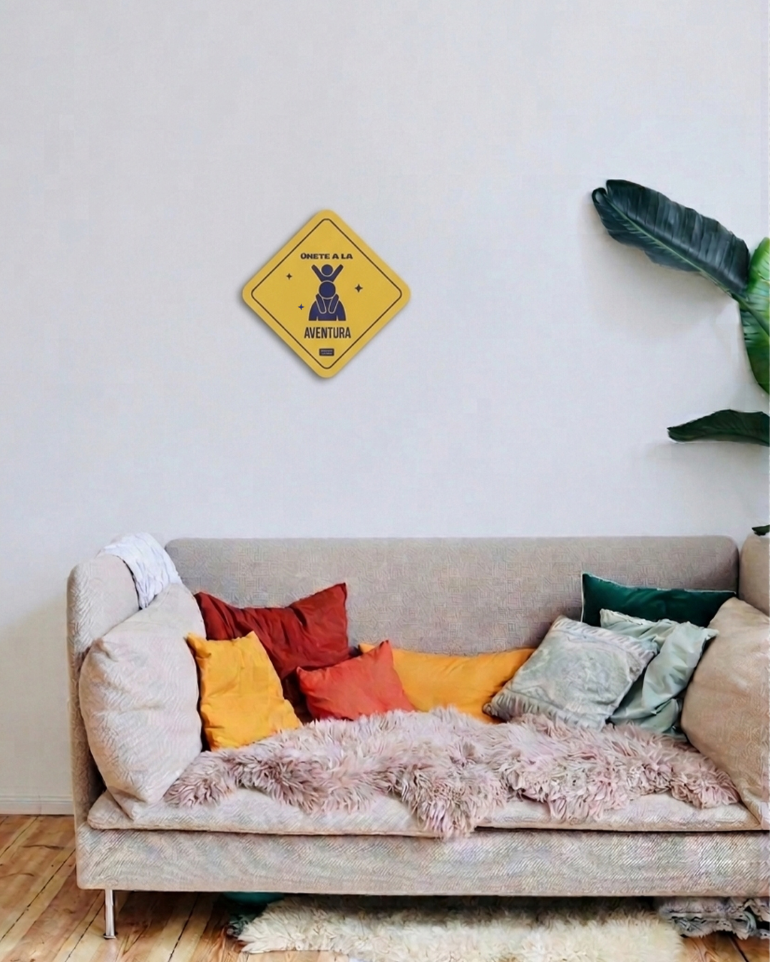 Placa en forma de rombo con diseño «Únete a la aventura» de 25×25 o 35×35 cm fabricada con materiales como aluminio, forex o lona plástica (a elegir entre esas 3 opciones). El diseño se imprime mediante tecnología de alta precisión, asegurando colores nítidos y duraderos.